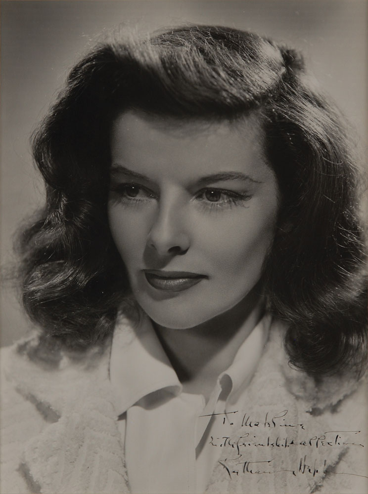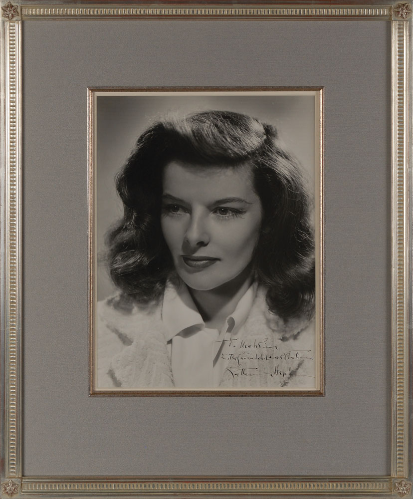 Exceptional vintage semi-glossy 9 x 12 close-up studio portrait of Hepburn by Clarence Sinclair Bull, signed and inscribed in fountain pen, “To Madeleine, with friendship & affection, Katherine Hepburn.” Double-cloth-matted and framed to an overall size of 17 x 20.5. In fine condition. Pre-certified PSA/DNA.