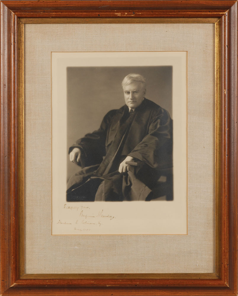 Vintage matte-finish 9 x 12.25 seated portrait of Justice Cardozo by Harris & Ewing, signed and inscribed in the lower border in fountain pen, “Faithfully yours, Benjamin Cardozo, Abraham S. Robinson, Esq., May, 1932.” Cloth-matted and framed to an overall size of 15.75 x 19.75. In fine condition, with light rippling. Pre-certified PSA/DNA.