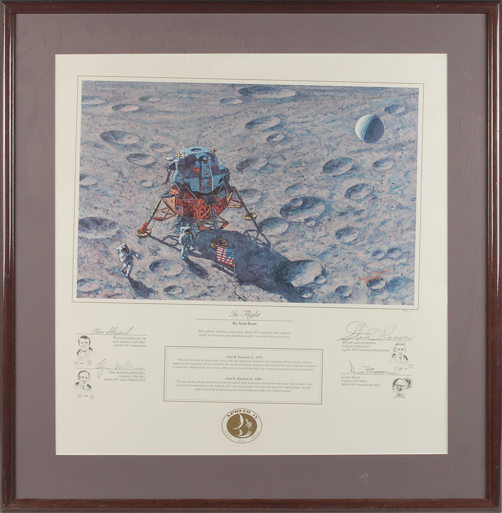 Gorgeous color limited edition 22 x 23 lithograph entitled ‘The Flight,’ depicting Alan Shepard hitting his famous lunar golf shot, numbered 686/850, signed in the lower border in pencil by crew members Alan Shepard, Edgar Mitchell, and Stuart Roosa, as well as astronaut and artist, Alan Bean. Matted and framed to an overall size of 28.25 x 29.75. Lithograph is slightly askew within frame, but could be easily recentered or removed. In fine condition, with a few trivial spots. Accompanied by the original Greenwich Workshop folder. Oversized. Please contact RR Auction for a shipping quote. Pre-certified Zarelli Space Authentication.