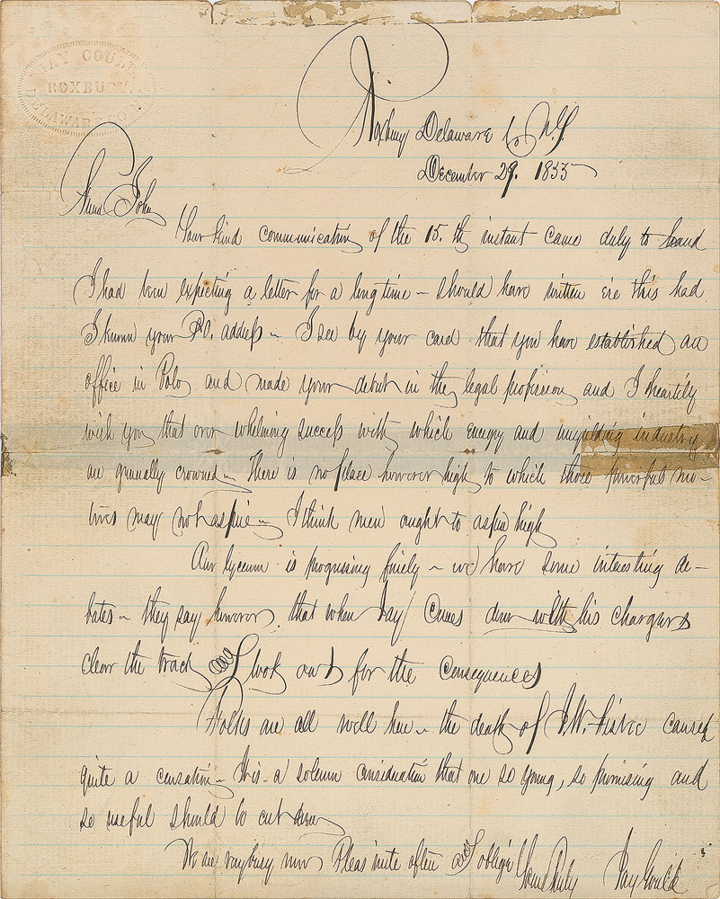 Financier (1836–1892) known for his stock market manipulation of railroad securities; he also tried to corner the gold market, leading to the ‘Black Friday’ stock market crash of September 1869. ALS, one page, lightly-lined, 7.75 x 9.75, December 29, 1855. Letter to John, in full: “Your kind communication of the 15th instant came duly to hand. I had been expecting a letter for a long time—Should have written ere this had I known your P.O. address. I see by your card that you have established an office in Polo and made your debut in the legal profession and I heartily wish you that over whelming success with which energy and unyielding industry are generally crowned. There is no place however high to which those principal motives may not aspire. I think men ought to aspire high. Our lyceum is progressing finely. We have some interesting debates—they say however that when Jay comes down with his chargers & clear the track, look out for the consequences. Folks are well here. The death of J. W. Fisher caused quite a censation [sic]. It is a solemn consideration that one so young, so promising and so useful should be cut down. We are very busy now. Please write often and oblige.” Upper left corner bears his personal blindstamp. In very good condition, with old tape residue along the top edge, and along the entire central horizontal fold. Pre-certified PSA/DNA.