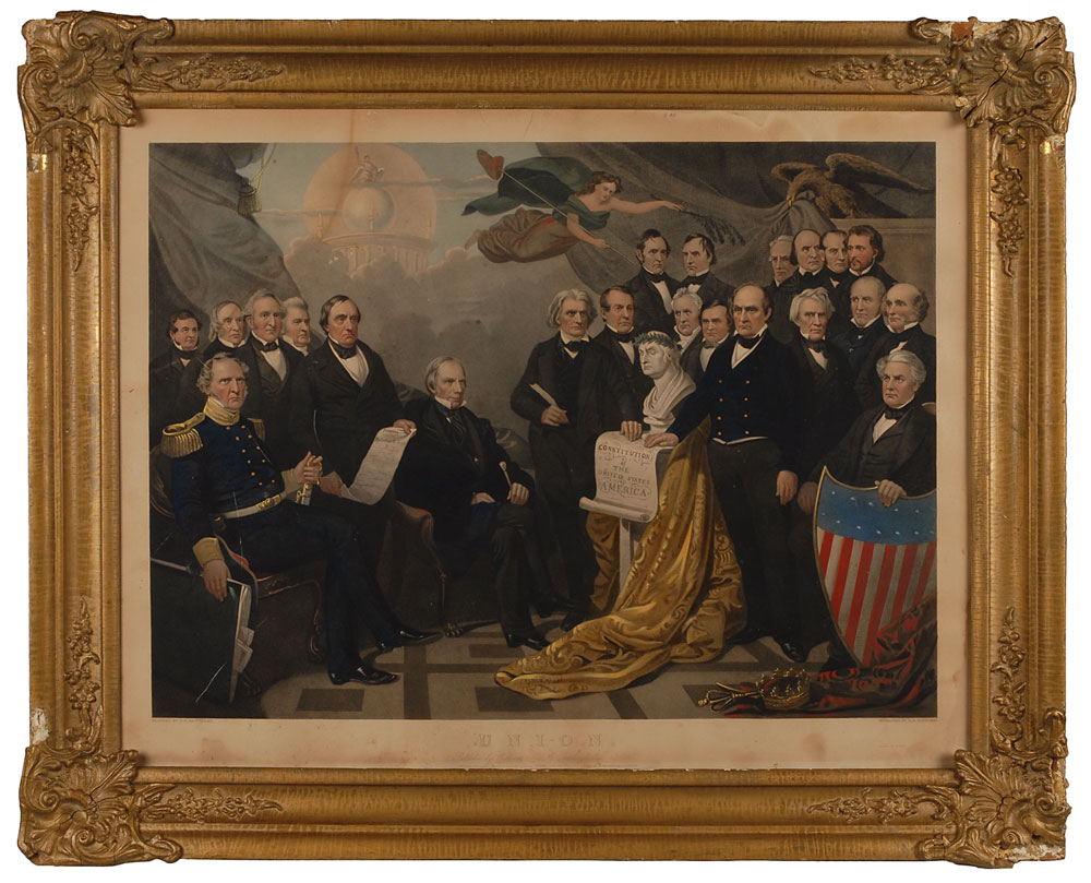 Remarkable color 28.5 x 22 lithograph of a T. H. Matteson painting of Daniel Webster standing with his hand placed on the Constitution and surrounded by many of the leading figures of the American Union, including Henry Clay, John C. Calhoun, James Buchanan, Stephen Douglas, John Bell, Martin Van Buren, Millard Fillmore, John C. Fremont, Lewis Cass, John Tyler, Winfield Scott, and others. Engraved by H.S. Sadd, and dated 1852. Published by William Pate of Burling Slip, New York. Framed and in very good to fine condition, with soiling and toning to the blank borders.