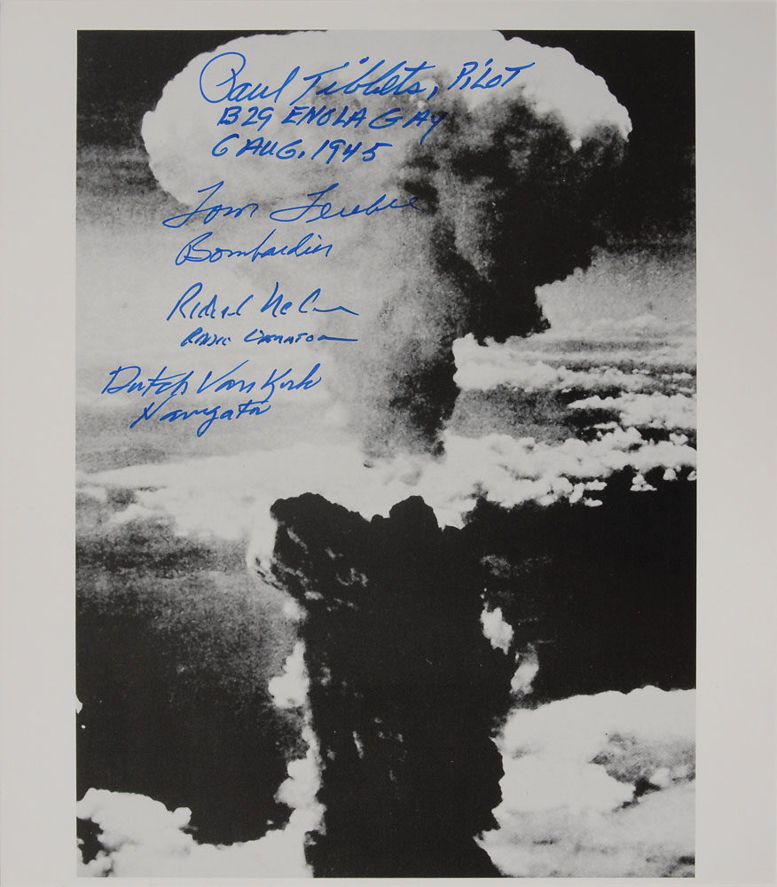 Powerful semi-glossy 8 x 9.25 cardstock photo of the bombing of Hiroshima, signed in blue felt tip, “Paul Tibbets, Pilot, B 29 Enola Gay, 6 Aug. 1945,” “Tom Ferebee, Bombardier,” “Richard Nelson, Radio Operator,” and “Dutch Van Kirk, Navigator.” In fine condition. Pre-certified PSA/DNA.