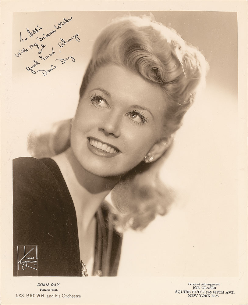Vintage glossy 8 x 10 James J. Kriegsmann publicity photo for Doris Day, set to be featured with Les Brown and his Orchestra, signed and inscribed in fountain pen, “To Eddie, with my sincere wishes and good luck, always, Doris Day.” Collector’s pencil notations on reverse indicate the signature was obtained in New York on July 26, 1944. In fine condition, with scattered creasing and surface impressions. Pre-certified PSA/DNA.