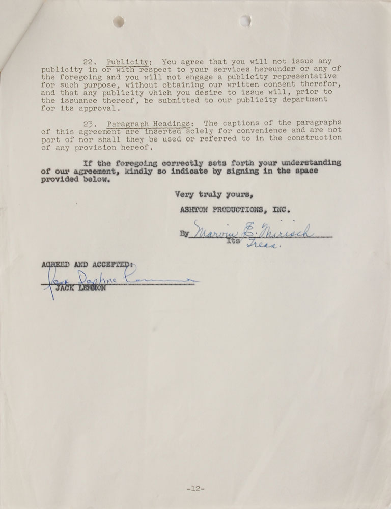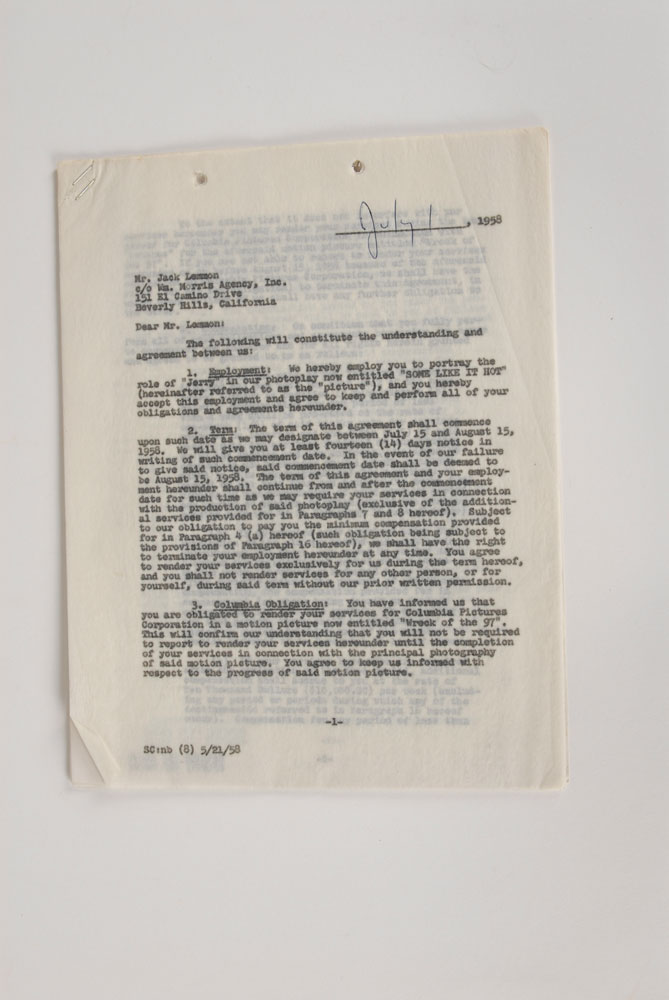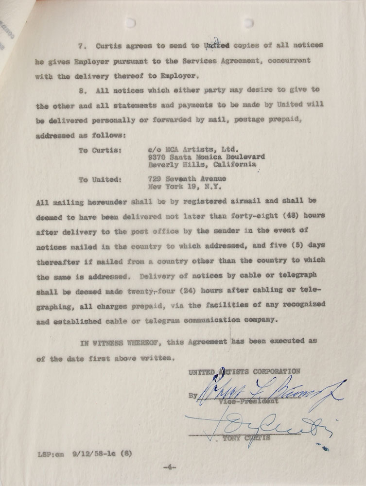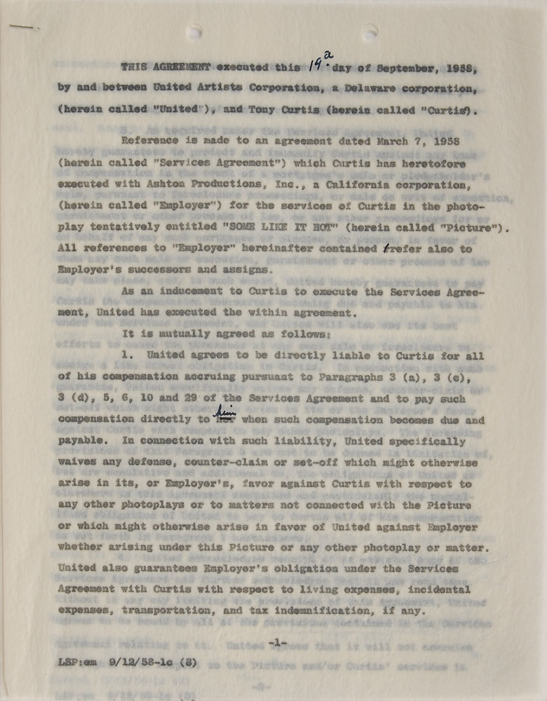 Pair of DSs: an inducement to an agreement between United Artists and Tony Curtis related to the latter’s services in “the photoplay tentatively entitled ‘Some Like It Hot,’” September 19, 1958, signed at the conclusion by Curtis; and an agreement between Ashton Productions and Jack Lemmon in which the latter agrees to “portray the role of ‘Jerry’” in the photoplay “now entitled ‘Some Like It Hot,’” July 1, 1958, signed at the conclusion by Lemmon. Also includes agreement contracts related to the referenced film, individually signed by actor George Raft and actress Paula Strasberg, as well as a letter signed by composer Leopold Stokowski. In overall fine condition. Pre-certified PSA/DNA.
