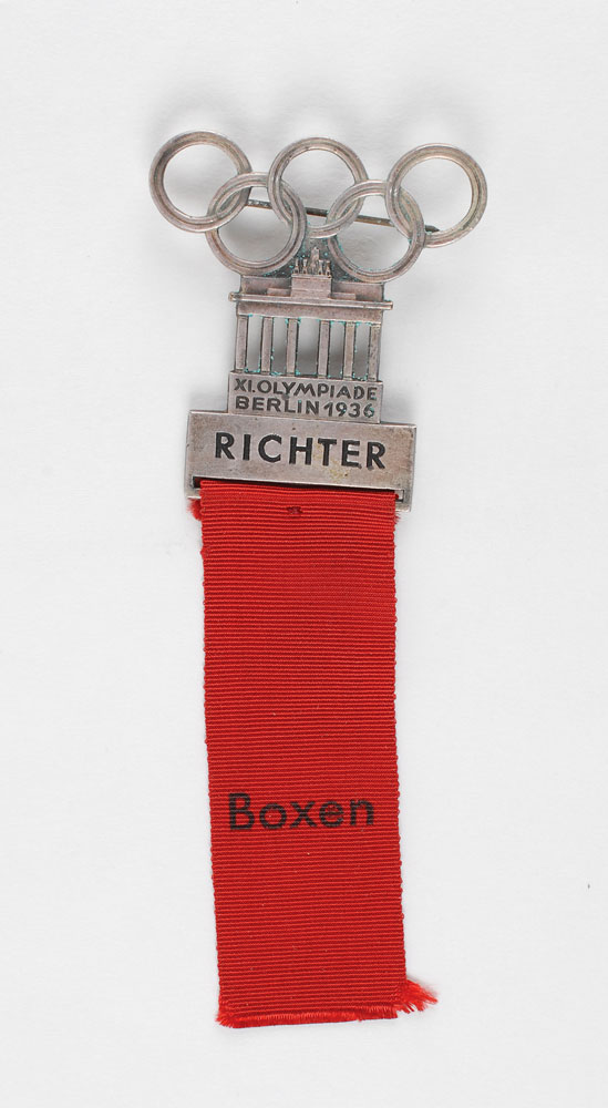 Judge ribbon issued for boxing at the 1936 Berlin Summer Olympics. Silvered bronze, 43 mm x 114 mm, 14 gm, manufactured by Lauer, featuring the Olympics rings over the Brandenburg Gate. The front is engraved “XL Olympiade Berlin 1936, Richter”; the reverse is engraved with the number “219.” Includes the original red ribbon with text, “Boxen.”
