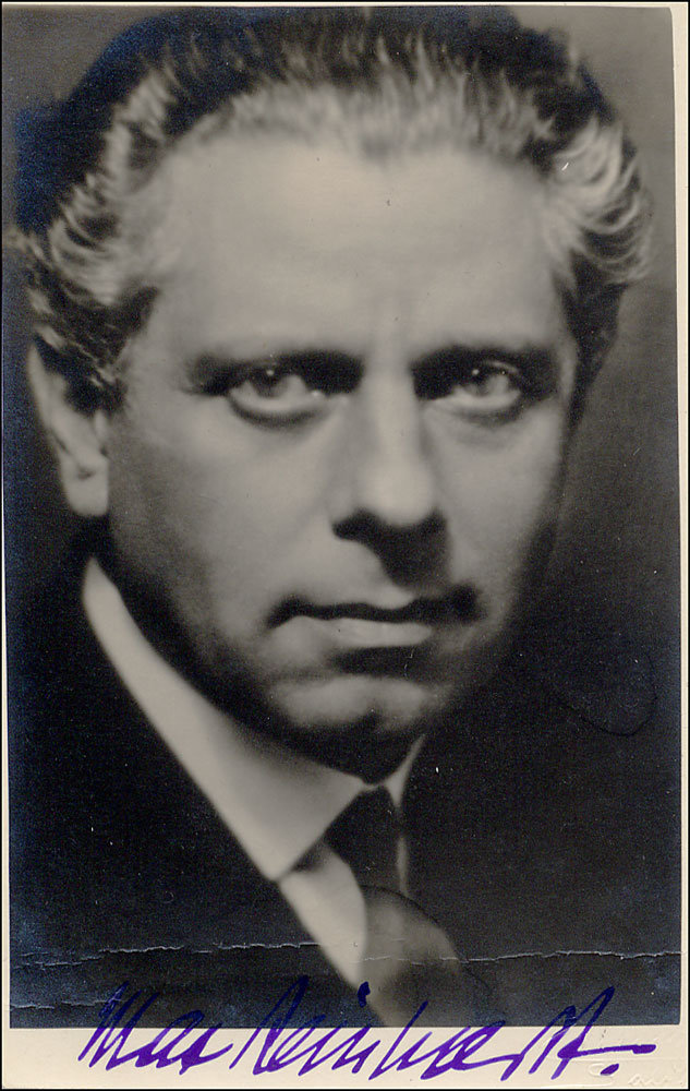 Innovative Austrian-American theater director and actor (1873–1943). Vintage 3.25 x 5.25 close-up postcard photo, signed along the bottom in purple fountain pen. In very good to fine condition, with two horizontal creases near the bottom and silvering to dark areas of the image. Pre-certified PSA/DNA.