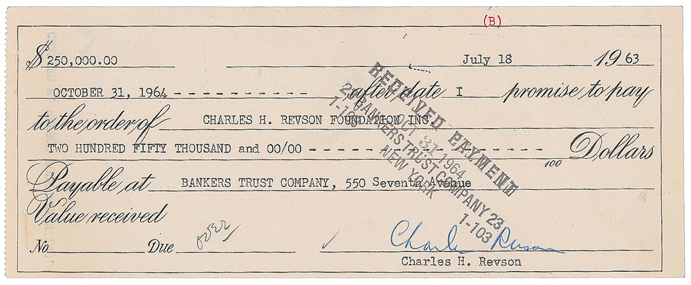 Pioneering cosmetics executive and philanthropist (1906–1975) who founded Revlon and managed the beauty products giant through five decades. DS, one page, 8 x 3.25, July 18, 1963. Promissory note for the Charles H. Revson Foundation in the amount of $250,000, signed at the conclusion in ballpoint by Revson. In fine condition. Pre-certified PSA/DNA.