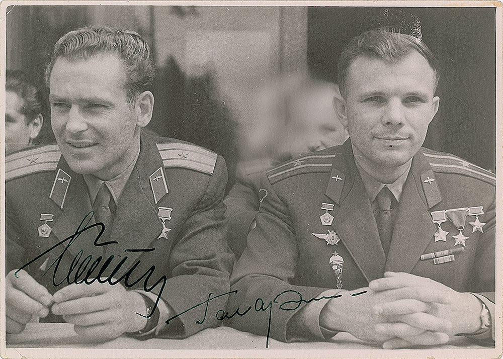 Vintage glossy 5 x 3.5 photo of Yuri Gagarin and Gherman Titov side-by-side, signed in fountain pen by both. In fine condition. Pre-certified Zarelli Space Authentication.