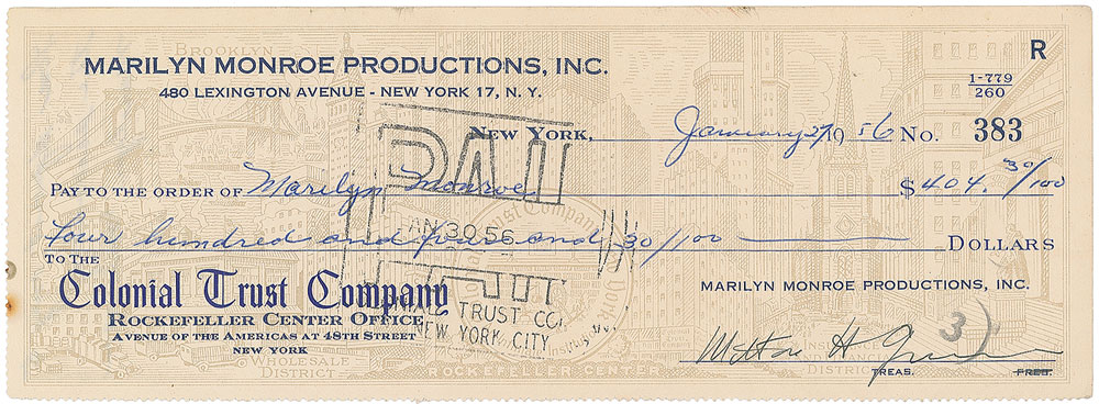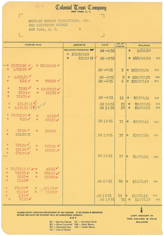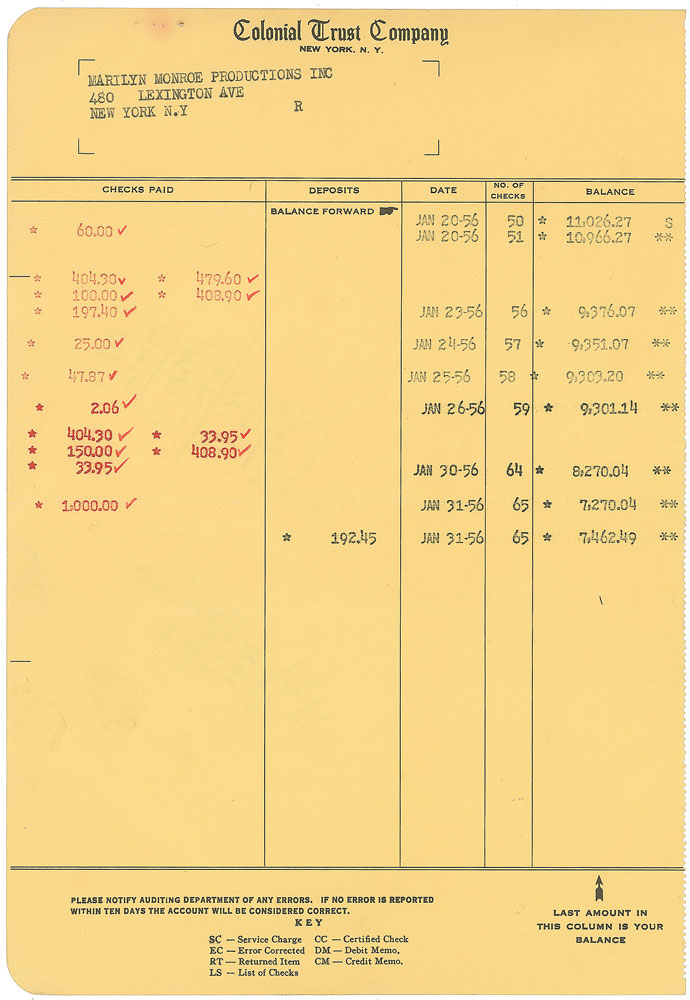 Marilyn Monroe Productions business check, 8.5 x 3, filled out in another hand and signed by famed photographer Milton Greene, “Milton H. Geene,” payable to Marilyn Monroe for $404.30, January 27, 1956. Also includes two pages worth of Marilyn Monroe Productions bank statements for the month of January 1956, showing significant activity in the account. In fine condition.