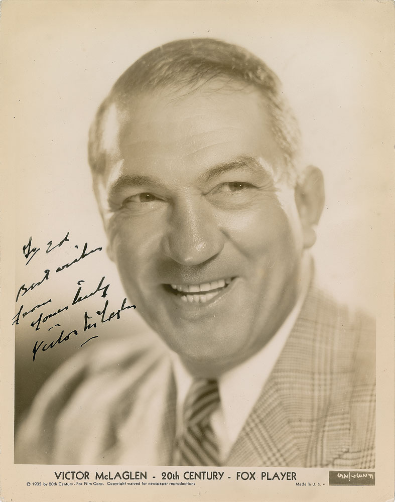English boxer and veteran of World War I (1886–1959) who became a successful film actor. Vintage 8 x 10 20th Century Fox publicity photo of McLaglen, signed and inscribed in fountain pen, “To Ed, Best wishes, from yours truly, Victor McLaglen.” In fine condition, with a few light surface impressions. Pre-certified PSA/DNA.