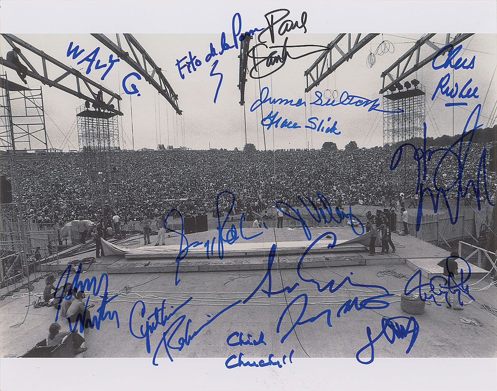Semi-glossy 14 x 11 photo of a stage and crowd at Woodstock, signed in blue and black felt tip by 16 musicians who performed at the concert, including: Grace Slick, Paul Kantner, Johnny Winter, Cynthia Robinson, Gregg Roli, Greg Errico, Wavy Gravy, Juma Sultan, Fito de la Parra, Chick Churchill, Jerry Velez, Rick Lee, Harvey Mandell, Steve Katz, Jerry Martini, and Tom Constanten. In fine condition. Pre-certified REAL.