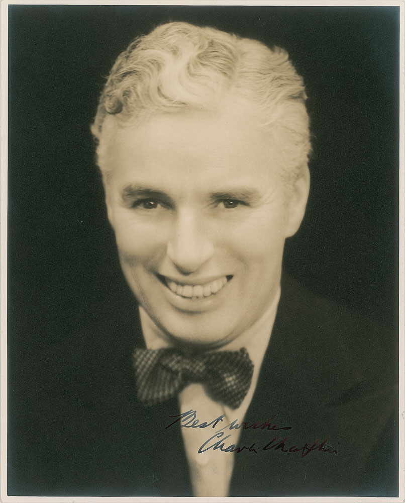 Striking vintage matte-finish 7.75 x 9.75 portrait of Chaplin wearing a bow tie, signed in fountain pen, “Best wishes, Charlie Chaplin.” In fine condition, with some light contrast to signature against the dark background. Pre-certified PSA/DNA.