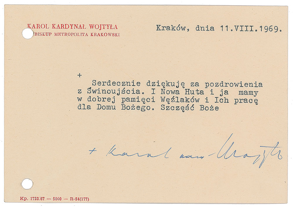 TLS in Polish, signed “Karol card. Wojtyla,” one page, 6 x 4, personal letterhead, August 11, 1969. In full (translated): "Thank you very much for the greetings from Swinoujscie. I and New Huta remember 'Wezlakow' and their hard work dedicated to the God's House. God bless you.” In fine condition, with two punch holes and a vertical crease to the left side. Pre-certified PSA/DNA.