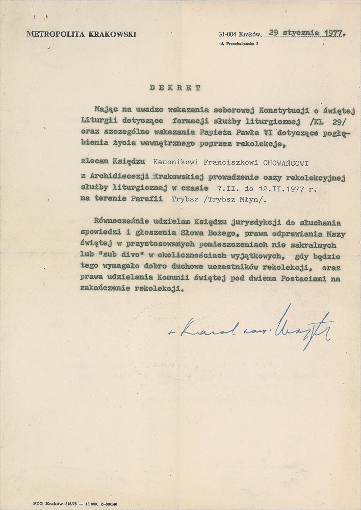 DS in Polish, signed “Karol card. Wojtyla,” one page, 8 x 11.5, January 29, 1977. An official decree, in part (translated): "Taking into the account indications from The Conciliar Constitution regarding Holy Liturgy and especially direct indications from The Pope Paul VI about deeper understanding of spiritual life through retreat I recommend Priest Franciszkowi Chowancowi from Archdiocese of Krakow that he will lead Retreat from 7.II to 12.II.1977 Trybsz/Trybsz Mlyn Parish. I also allow The Priest jurisdiction to listen confession and lead Holy Masses in special rooms which are not sacral or ‘sub divo’ but only in a special circumstances. I allow this only if it will be spiritually beneficial for the people which are taking part in the retreat. I also allow him to provide Holly Communion at the end of retreat.” In fine condition. Pre-certified PSA/DNA.