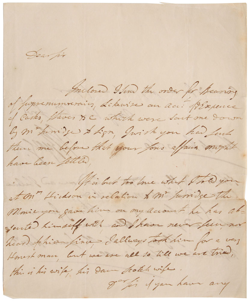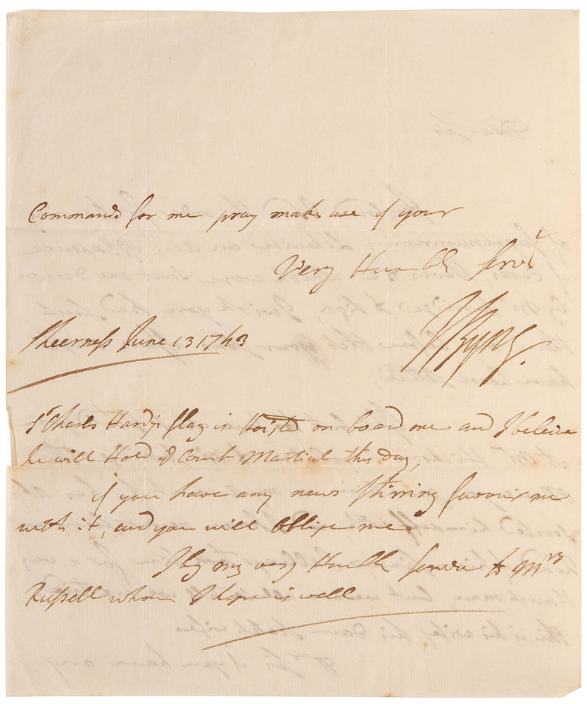 Royal Navy officer (1704–1757) whose loss of Minorca at the beginning of the Seven Years’ War led to his execution. ALS signed “J. Byng,” one page both sides, 7.5 x 8.75, June 13, 1743. In part: “Inclosed I send the order…of Expence of corks, staves, etc, which were sent me…It is but true what I told you at Mr. Hickson in relation to Mr. Surrdige the Monie you gave him on my account he has absented himself with and I have never seen nor heard of his since, I always took him for a very Honest man, but we are all so till we are tried, this is his wife, his damn Scotch wife.” Byng adds a lengthy postscript, in part: “Charles Hardy’s flag is Hoisted on board one and I believe he will Hold if Court Martial this day, If you have any news…favour me with it, and you will oblige me.” In fine condition, with some light foxing, and writing showing through from opposing sides. Pre-certified PSA/DNA.