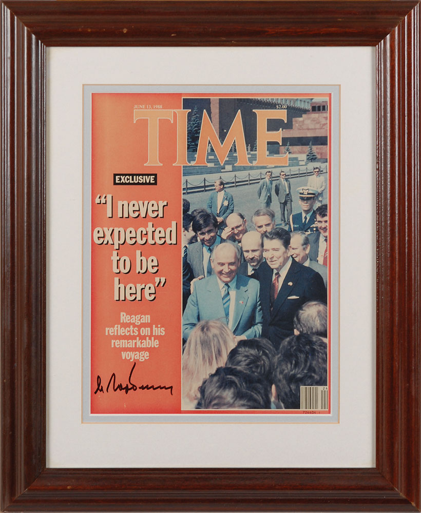 Limited edition cover of Time magazine from June 13, 1988, showing Ronald Reagan and Mikhail Gorbachev on the front cover, numbered 9/175, signed in black felt by Gorbachev. Double-matted and framed. In fine condition. Accompanied by a certificate of authenticity from Score Board. Pre-certified PSA/DNA.