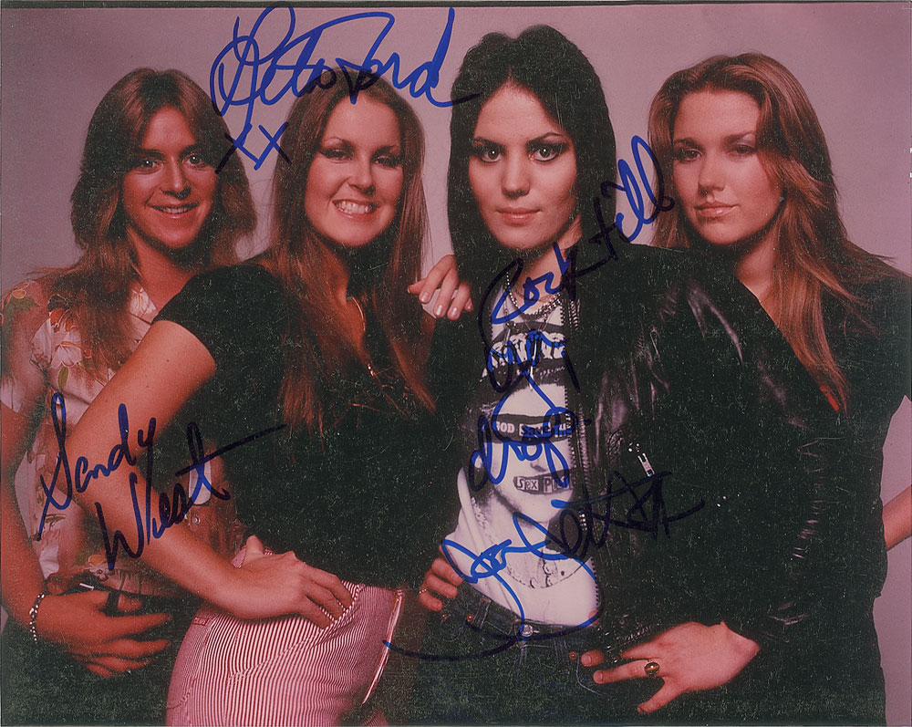 Color glossy 10 x 8 photo of the group, signed in blue felt tip, “Rock till ya drop! Joan Jett,” “Lita Ford, xx,” and “Sandy West.” In fine condition, with very light surface scuffing. Pre-certified REAL.