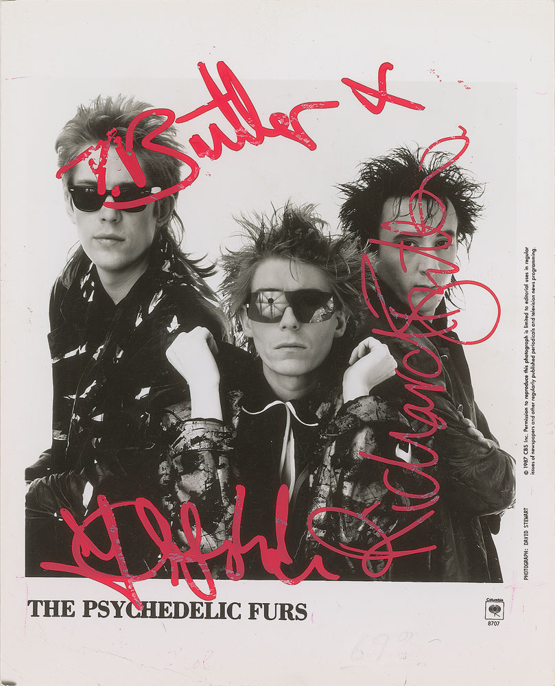 Circa 1987 glossy 8 x 10 Columbia publicity photo of The Psychedelic Furs, signed in red paint pen by Richard Butler, Tim Butler, and Rich Good. In very good to fine condition, with scattered light creasing and surface impressions, and some scuffing to the red paint pen. Consignor notes that the signatures were obtained in person before a show in Cleveland, Ohio. Pre-certified REAL.
