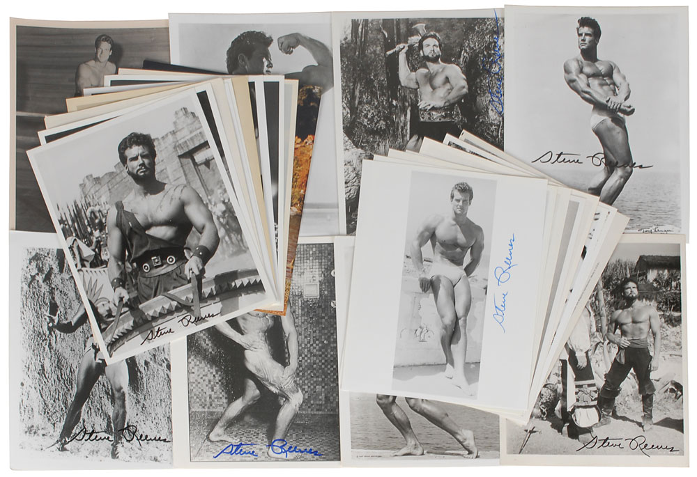 Fantastic collection of twenty-six glossy photos of the musclebound leading man, each approximately 8 x 10 and 10 x 8, and signed in felt tip by Reeves, with two inscribed. Many of the photos depict Reeves during his early bodybuilding days and then as his most famous character, Hercules. In overall fine condition.