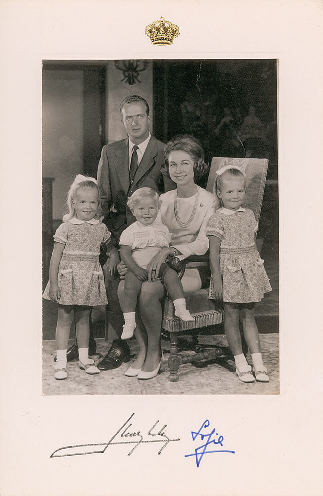 King of Spain (born 1938) who ascended the throne in 1975, two days after the death of Francisco Franco, and oversaw the troubled nation’s transition to a constitutional monarchy. Textured matte-finish 4 x 6 photo of the King of Spain and the Queen consort of Spain posing with their three children, affixed to its original 5.75 x 8.5 mount, signed on the mount in black felt tip by Juan Carlos, and in blue felt tip by his wife Sophia. In fine condition, with a diagonal crease to image. Accompanied by a matte-finish 4 x 6 portrait of Juan de Borbon, father of Juan Carlos, signed in the lower border and dated 1974. Pre-certified PSA/DNA.