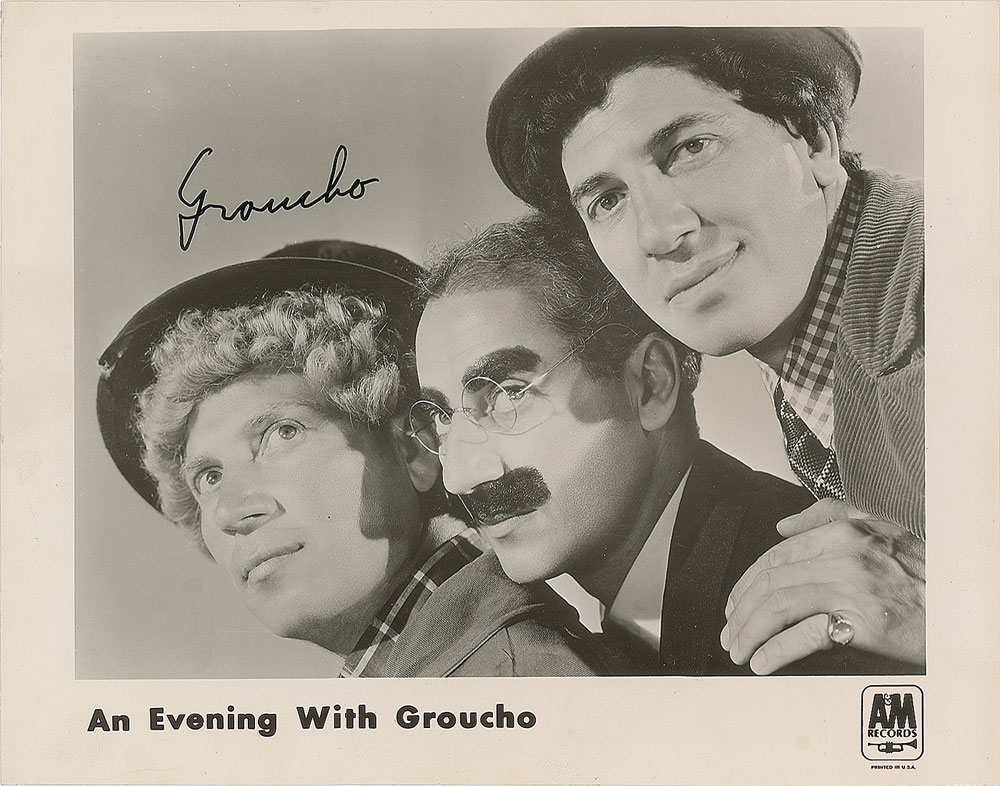 Glossy 10 x 8 A&M Records publicity photo for An Evening with Groucho, signed in black felt tip, “Groucho.” In fine condition. Pre-certified PSA/DNA.