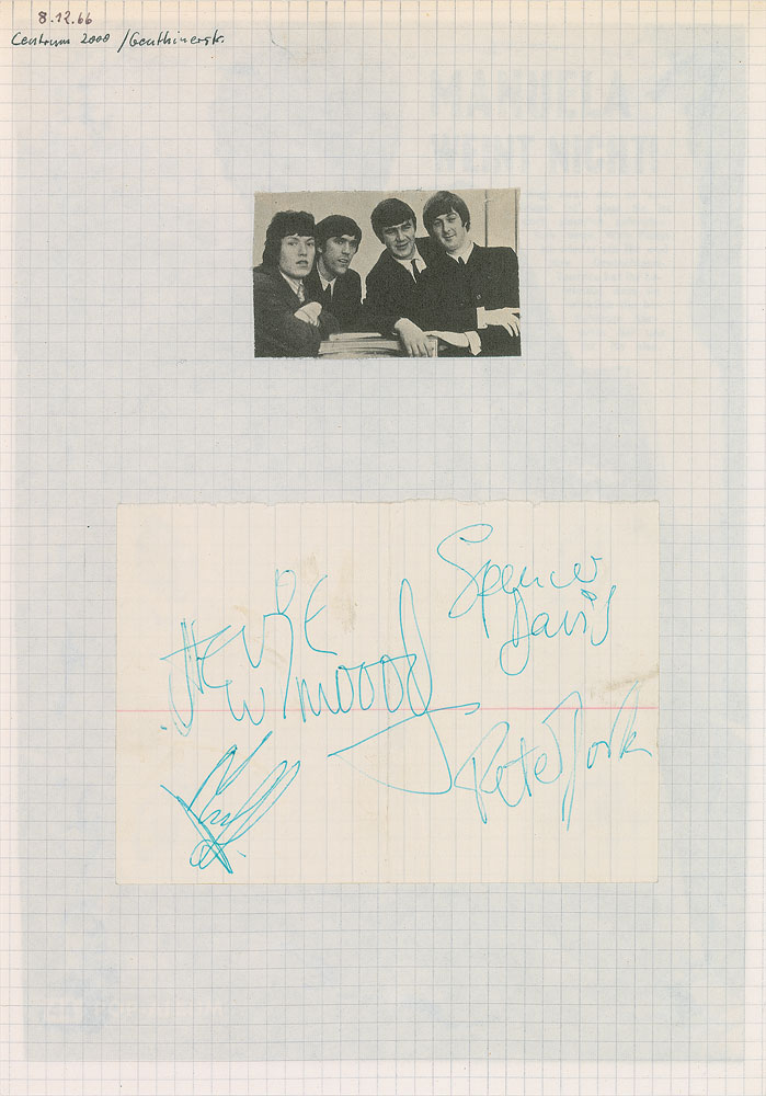 Vintage ballpoint signatures of Spencer Davis, Pete York, Steve Winwood, and Muff Winwood on an off-white 5.75 x 4 lightly-lined sheet affixed to a larger gridded sheet bearing affixed band clippings on the front and back. In fine condition, with intersecting folds. Collector’s ink notations in upper left corners indicate that the signatures were obtained in Germany on December 8, 1966. Pre-certified REAL.