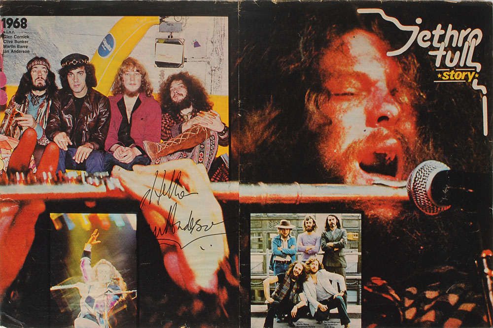 Three items: a color 11.25 x 17.75 magazine centerfold photo of Ian Anderson holding a saxophone, signed in black felt tip by Anderson; a color 19.25 x 12.25 magazine photo (two pages affixed side-by-side) of Jethro Tull, signed in black felt tip by Anderson; and a light green 12.75 x 19.75 scrapbook page bearing affixed magazine photos of Jethro Tull, with both sides signed in black felt tip by Anderson, John Evan, and Barriemore Barlow. In overall very good to fine condition, with scattered overall creasing. Consignor notes that these vintage signatures were obtained in person in Vienna during the early to mid-1970s. Pre-certified REAL.
