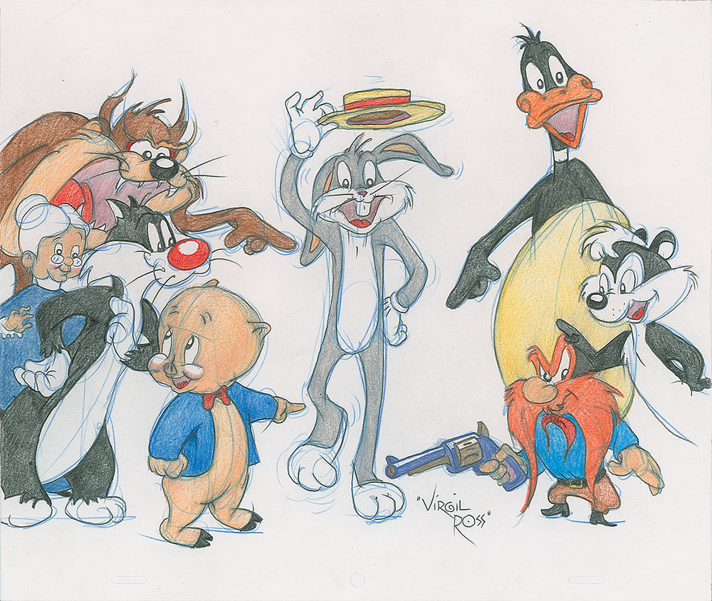 (Warner Brothers Studios, circa 1990s) Original drawing by Virgil Ross showing a dancing Bugs Bunny alongside an admiring audience of Sylvester, Daffy Duck, Porky Pig, Tasmanian Devil, Pepe Le Pew, Yosemite Sam, and Granny, signed below in pencil by Ross. Accomplished in graphite and colored pencil on untrimmed 12.5 x 10.25 animation paper, with the total Image measuring 12.5 x 9. In fine condition.