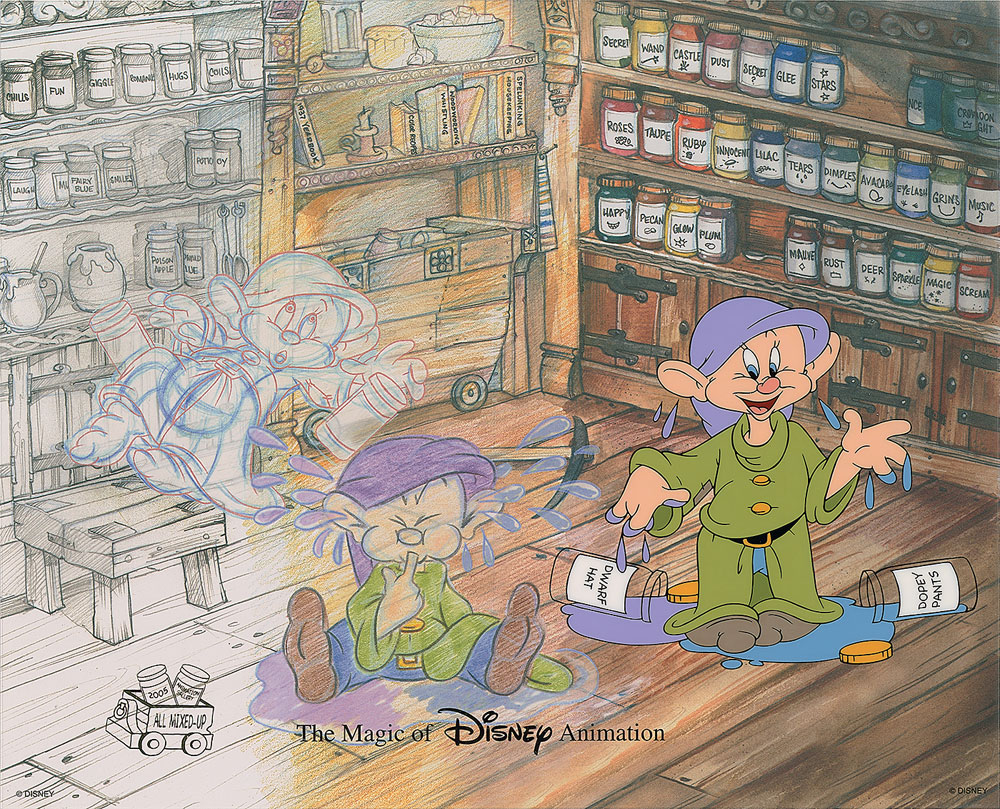 (Walt Disney Studios, 2005) Original limited edition hand-painted cel featuring Dopey with spilled cans of paint entitled ‘All Mixed Up,’ sold only in 2005 in the Disney-MGM Studios theme park at Disney World. These cels were painted for the ‘Magic of Disney Animation’ series. The cel is placed on a printed color background. Character image measures 5.5 x 5, with overall dimensions of 13 x 10.5. In fine condition.