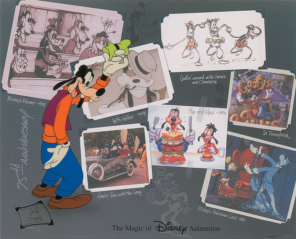 (Walt Disney Studios, 2007) Original limited edition hand-painted cel featuring Goofy tipping his cap entitled ‘Goofy Moments,’ sold only in 2007 in the Disney-MGM Studios theme park at Disney World. These cels were painted for the ‘Magic of Disney Animation’ series. The cel is placed on a printed color background. Character image measures 4 x 7.5, with overall dimensions of 13 x 10.5. In fine condition.