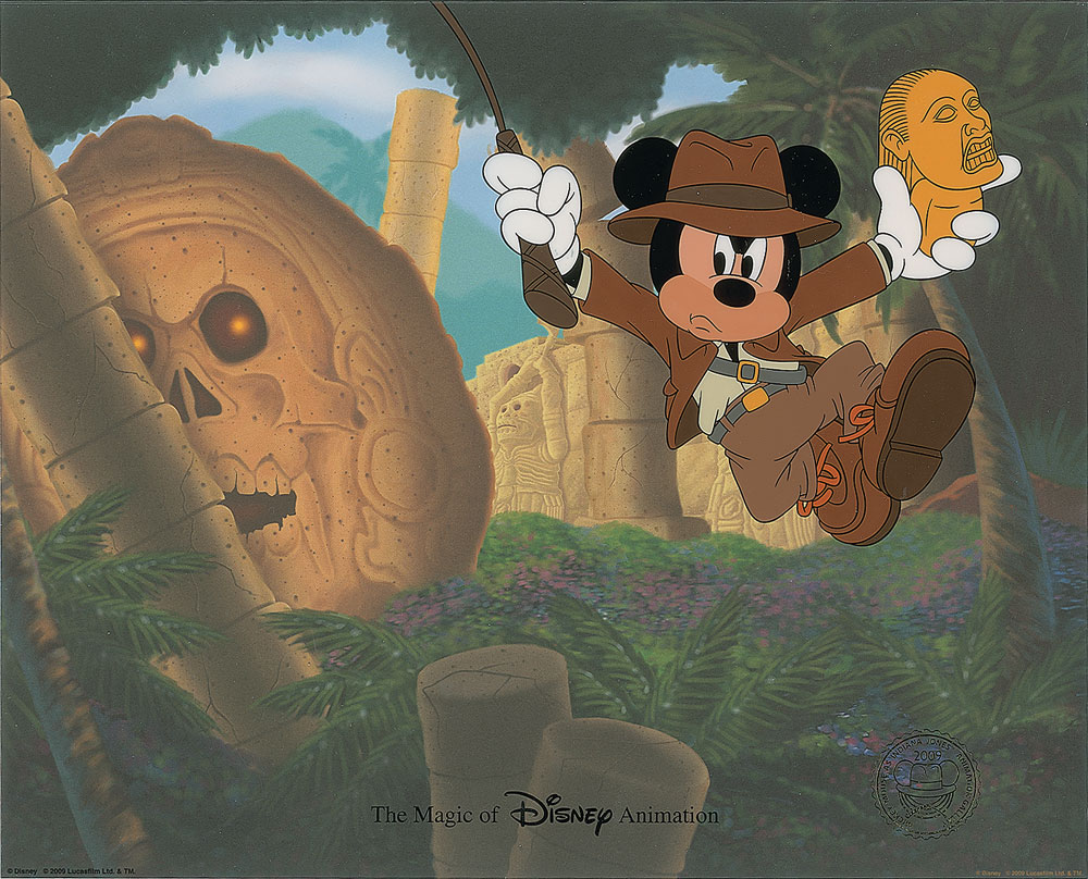 (Walt Disney Studios, 2009) Original limited edition hand-painted cel featuring the relic-hunting Mickey Mouse entitled ‘Mickey Mouse as Indiana Jones,’ sold only in 2009 in the Disney-MGM Studios theme park at Disney World. These cels were painted for the ‘Magic of Disney Animation’ series. The cel is placed on a printed color background. Character image measures 7 x 6.5, with overall dimensions of 13 x 10.5. In fine condition.