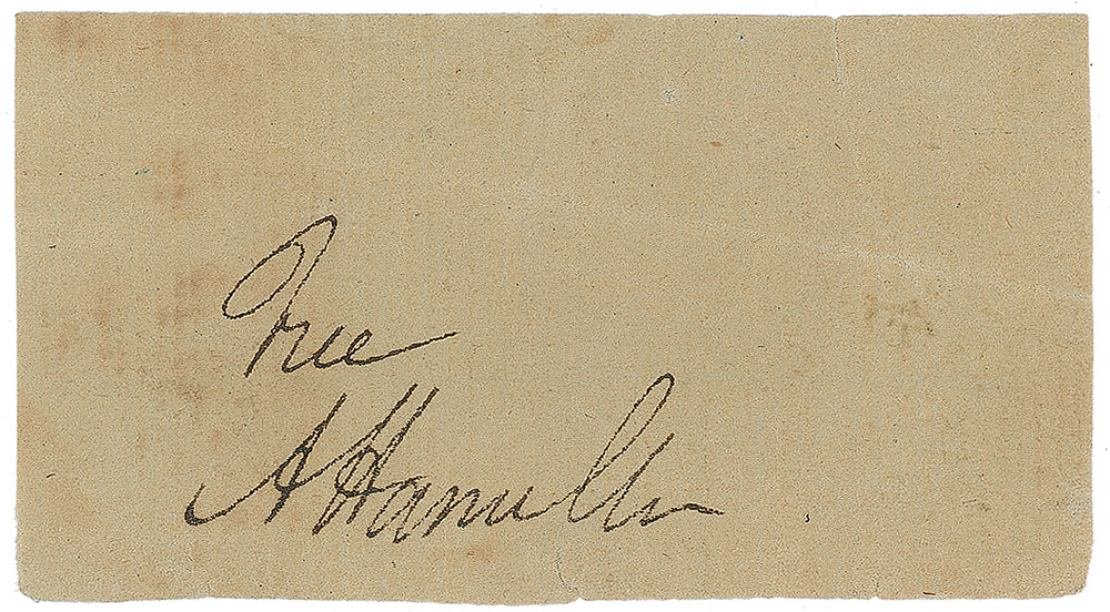 Extremely desirable crisp ink signature, “Free, A. Hamilton,” on an off-white 2.5 x 1.5 slip clipped from a free frank. In fine condition, with a light diagonal crease and scattered soiling. Pre-certified PSA/DNA.