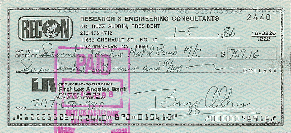 RECON business check, 6 x 2.75, filled out and signed by Aldrin, payable to Security Pacific National Bank for $769.16, January 5, 1986. In fine condition. Pre-certified Zarelli Space Authentication.