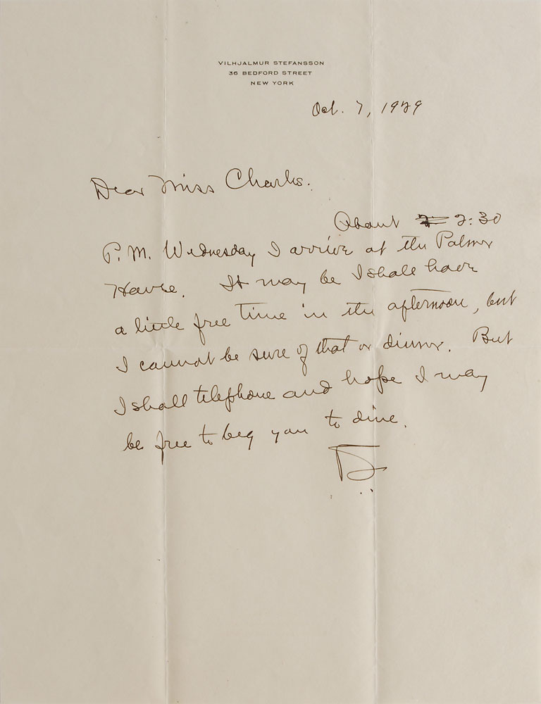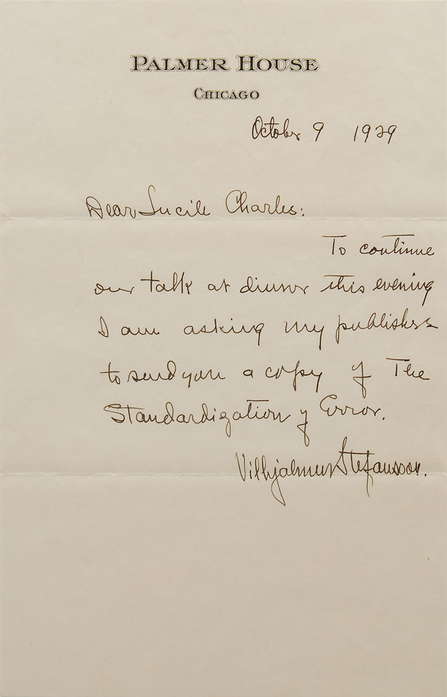Canadian explorer and ethnologist (1879–1962) best known for his expeditions to the Arctic and for his studies of the native peoples there. Two ALSs, one signed in full and one signed with an initial, each one page, October 1929. The first, in part: “About 2:30 P.M. Wednesday I arrive at the Palmer Hotel. It may be I shall have a little free time in the afternoon, but I cannot be sure of that.” The second, in part: “To continue our talk at dinner this evening I am asking my publisher to send you a copy of The Standardization of Error.” In overall fine condition. Accompanied by both original mailing envelopes addressed in Stefansson’s hand. Pre-certified PSA/DNA.
