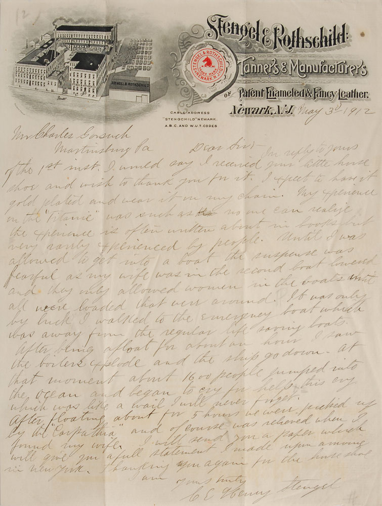 ALS signed “C. E. Henry Stengel,” one page, 8.25 x 11, Stengel & Rothschild Tanners & Manufacturers letterhead, May 3, 1912. Letter to Charles Gorsuch in Martinsburg, Pennsylvania. In part: “My experience on the ‘Titanic’ was such as no one can realize the experience is often written about in books but very rarely experienced by people. Until I was allowed to get into a boat the suspense was fearful as my wife was in the second boat lowered and they only allowed women in the boats and with all were loaded that were around. It was only by luck I walked to the emergency boat which was away from the regular life saving boats. After being afloat for about an hour I saw the boilers explode and the ship go down. At that moment about 1600 people jumped into the ocean and began to cry for help this cry which was like a wail I will never forget. After floating for about 5 hours we were picked up by the ‘Carpathia’ and of course was relieved when I found my wife.” In fine condition. Accompanied by the original mailing envelope addressed in his own hand.