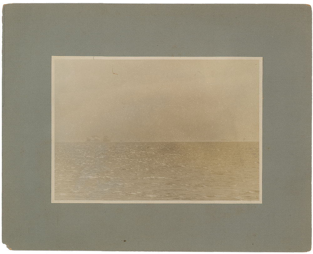Louis M. Ogden was a New York socialite aboard the RMS Carpathia during the Titanic disaster who helped to photograph, document, and assist the survivors. This was among the thirty images he captured that day, and he kept a similar example in a personal album identified as, ‘The berg the Titanic struck, taken at sunrise’ [photocopy included]. The shape of the iceberg in this photograph is also a close match to a drawing by artist Colin Campbell Cooper, also a passenger aboard the Carpathia, who made a sketch of the two-peak iceberg on the horizon on the morning after the disaster. Photographs of this iceberg are understandably tremendously rare, and often disputed; the preponderance of evidence supporting this example make it a truly spectacular, museum-quality piece.