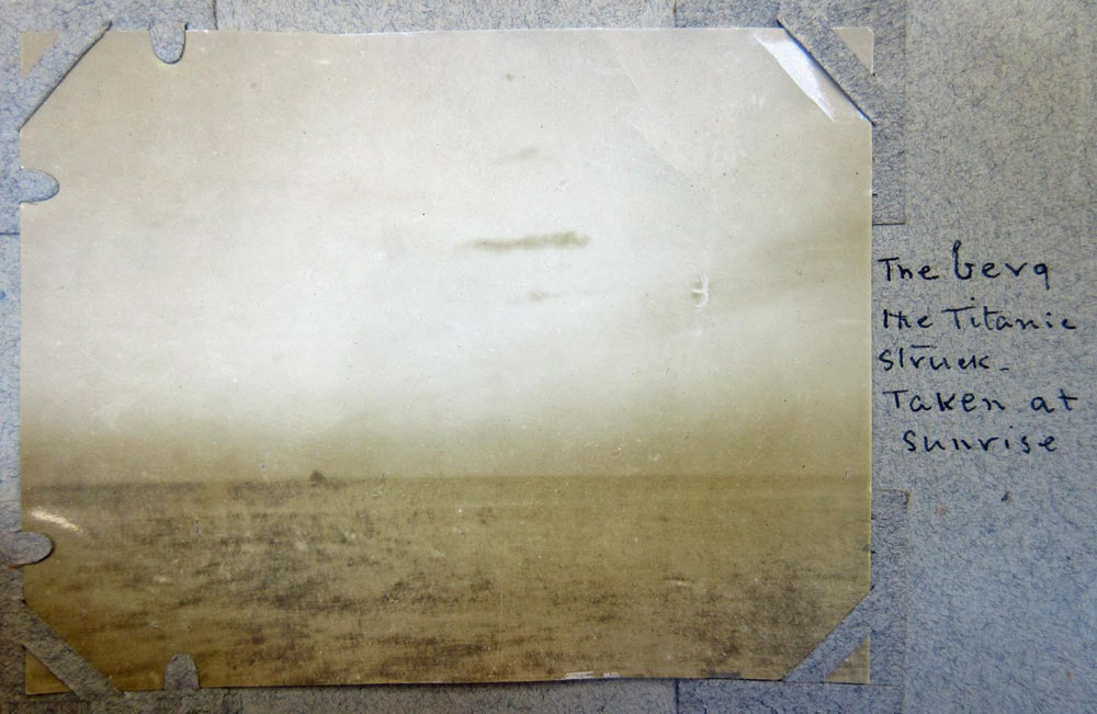 Remarkable original mounted matte-finish 6.75 x 4.75 photograph of the infamous iceberg that the Titanic struck on the night of April 14, 1912, affixed to its original 9.75 x 8 photographic mount. The photograph, taken by Carpathia passenger Louis M. Ogden on the morning of April 15, depicts the North Atlantic horizon, with the iceberg at the left. In fine condition, with a tiny piece missing from the lower left corner tip of the mount.
