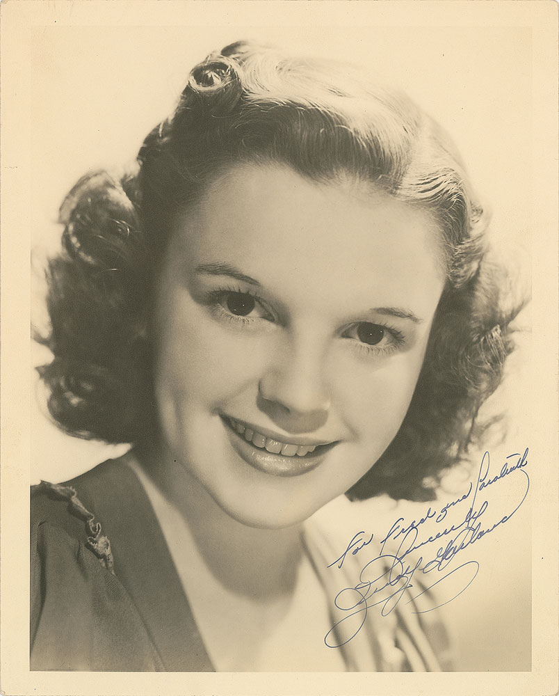 Lovely vintage matte-finish 8 x 10 publicity portrait of Garland smiling into the camera, signed and inscribed in fountain pen, “For Fred and Carolruth, Sincerely, Judy Garland.” In very fine condition. Pre-certified PSA/DNA.