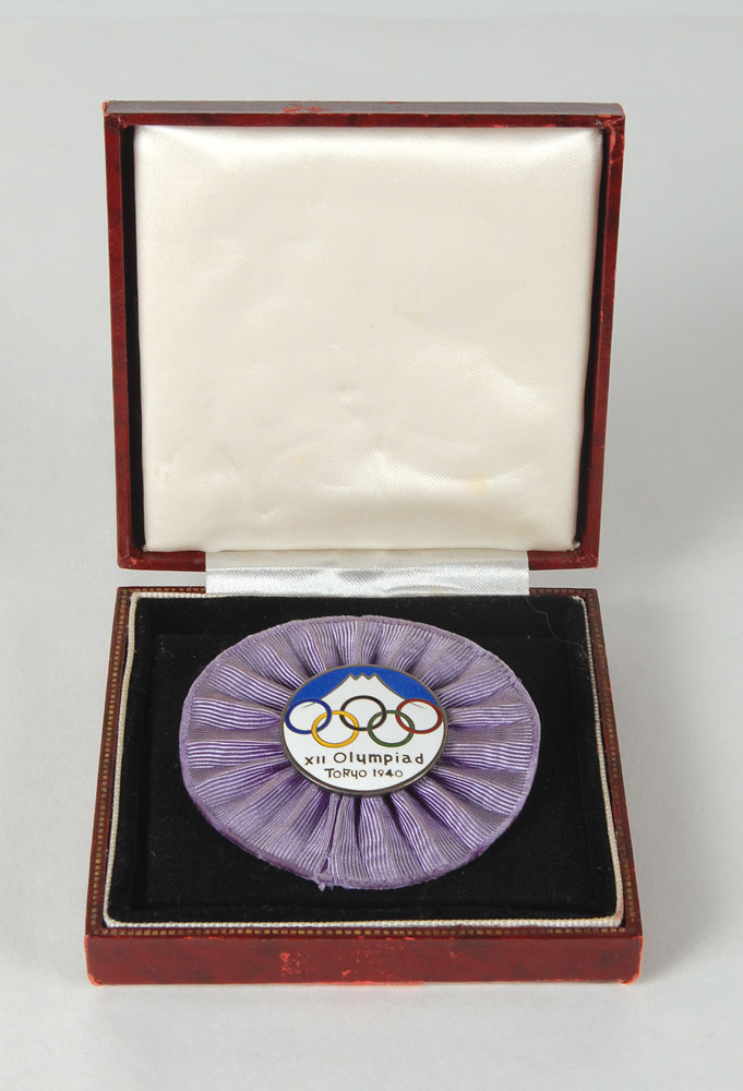 Rare official’s badge for the canceled Tokyo 1940 Summer Olympics. Set on a mauve rosette, the silvered and enameled pin, 38 mm in diameter, shows the Olympic rings against Mount Fuji, and reads, “XII Olympiad, Tokyo 1940.” Includes a leather presentation case. The start of the second Sino–Japanese on July 7, 1937, raised the question among both the Japanese and the international community whether Tokyo still remained a logical Olympic host city. As the Japanese war effort continued to mount, the Games were forfeited to Helsinki, Finland, the runner-up in the original bidding process, but were soon suspended indefinitely following the outbreak of World War II. A solemn remembrance from Tokyo’s lost 1940 Olympics.