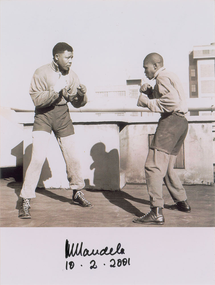 Appealing glossy 8 x 10.5 photo of Mandela sparring with Jerry Moloi, a professional featherweight, at Moloi's boxing gym in Orlando, Soweto, signed in the lower border in black felt tip, “N. Mandela, 10.2.2001.” In fine condition, with a small bend to the upper right corner tip. Pre-certified PSA/DNA.