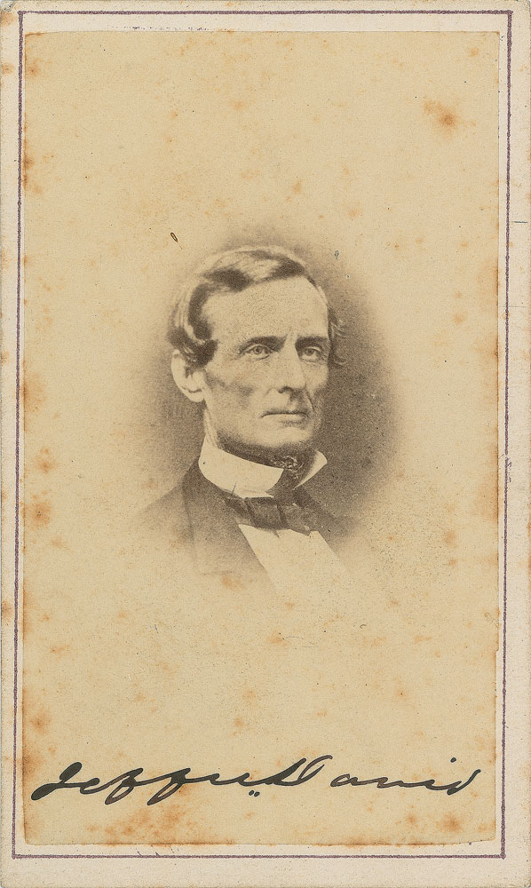 Rare 2.25 x 4 carte-de-visite portrait of Davis, signed in ink, “Jeffn Davis.” Published by C. R. Rees & Bros. of Richmond, Virginia. In very good to fine condition, with scattered light foxing. Pre-certified PSA/DNA.