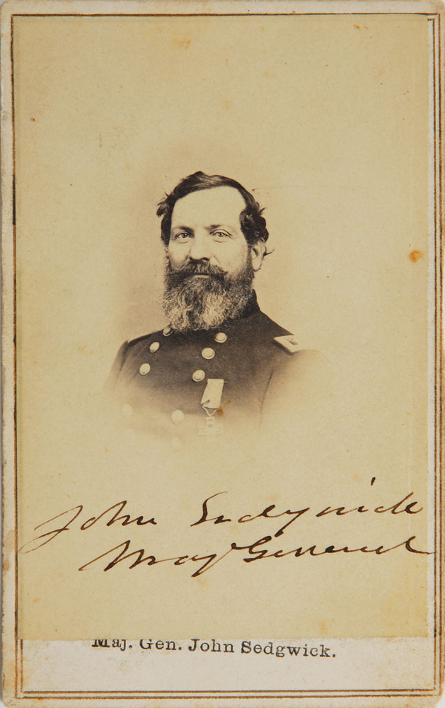 Union general (1813–1864) who was killed by Confederate sharpshooters at the Battle of Spotsylvania Court House, ironically while berating his men for hiding from enemy fire. Handsome 2.5 x 3.75 carte-de-visite bust-length portrait of Sedgwick posing in his military uniform, signed in ink, “John Sedgwick, Maj. General.” In fine condition. Pre-certified PSA/DNA.