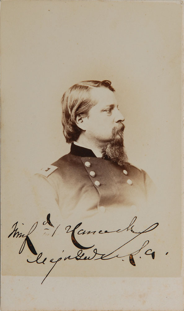 Appealing 2.25 x 4 carte-de-visite portrait of Hancock wearing his military uniform in profile, signed in ink, “Winf’d S. Hancock, Maj. Genl. U. S. A.,” who signs and inscribes the reverse, “For Brig. Maj. Genl J. L. Donaldson, with compliments of, Winf’d S. Hancock, Major Genl. U. S. A., Fort Leavenworth, Kansas, January 7, 1867.” Published by F. Gutenkunst of Philadelphia. In fine condition. Pre-certified PSA/DNA.