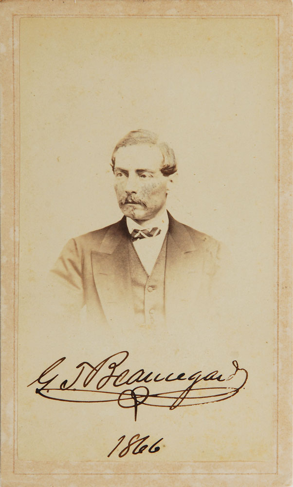 Seldom-seen 2.5 x 4.25 carte-de-visite head-and-shoulders portrait of Beauregard, signed in ink, “G. T. Beauregard, 1866.” Published by S. Anderson of New Orleans. In fine condition. Pre-certified PSA/DNA.