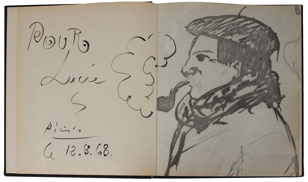 Signed book: Picasso. Paris: O. D. E. J., 1965. Clothbound hardcover, 9.5 x 10.75, 48 pages. Stylishly signed and inscribed on the reverse of the first free end page in black felt tip, “Pour Lucie, Picasso, 12. 8. 68,” adding a plume of smoke on the left page to accent the printed image of a man with pipe on the facing page. In fine condition. An exceptionally clean and bold inscription highlighted by the rare addition of a Picasso sketch. Pre-certified PSA/DNA.