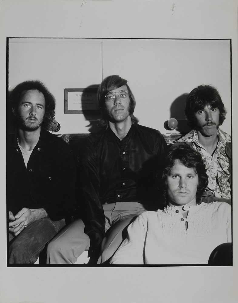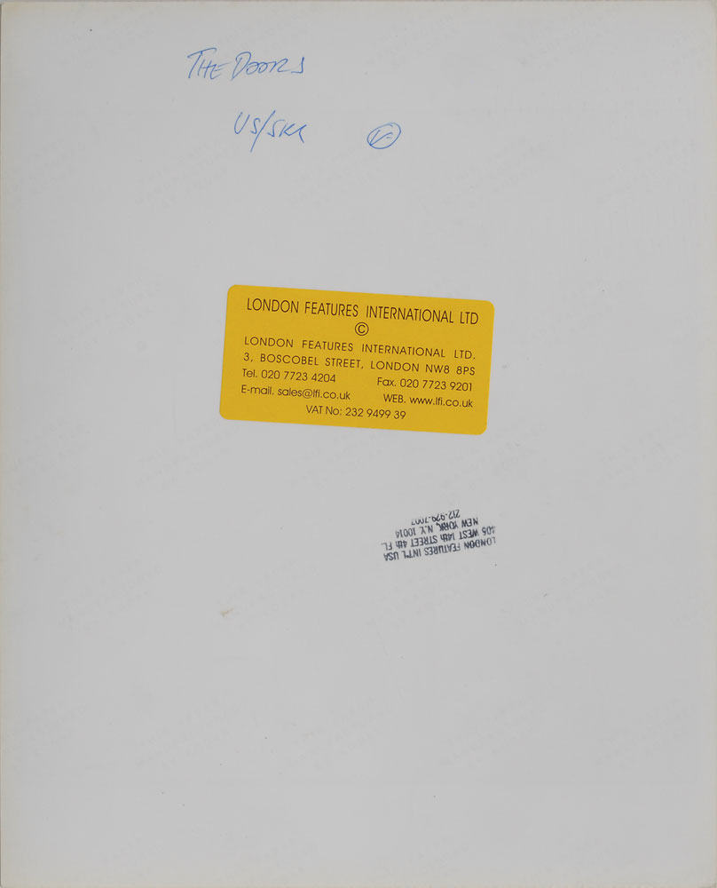 Original vintage glossy 8 x 10 silver gelatin photo of The Doors in a casual setting, with Jim Morrison seated at lower right. Reverse bears a London Features International Ltd. stamp and label. In fine condition, with two bits of adhesive remnant to upper blank border. From the Globe Photo archives.