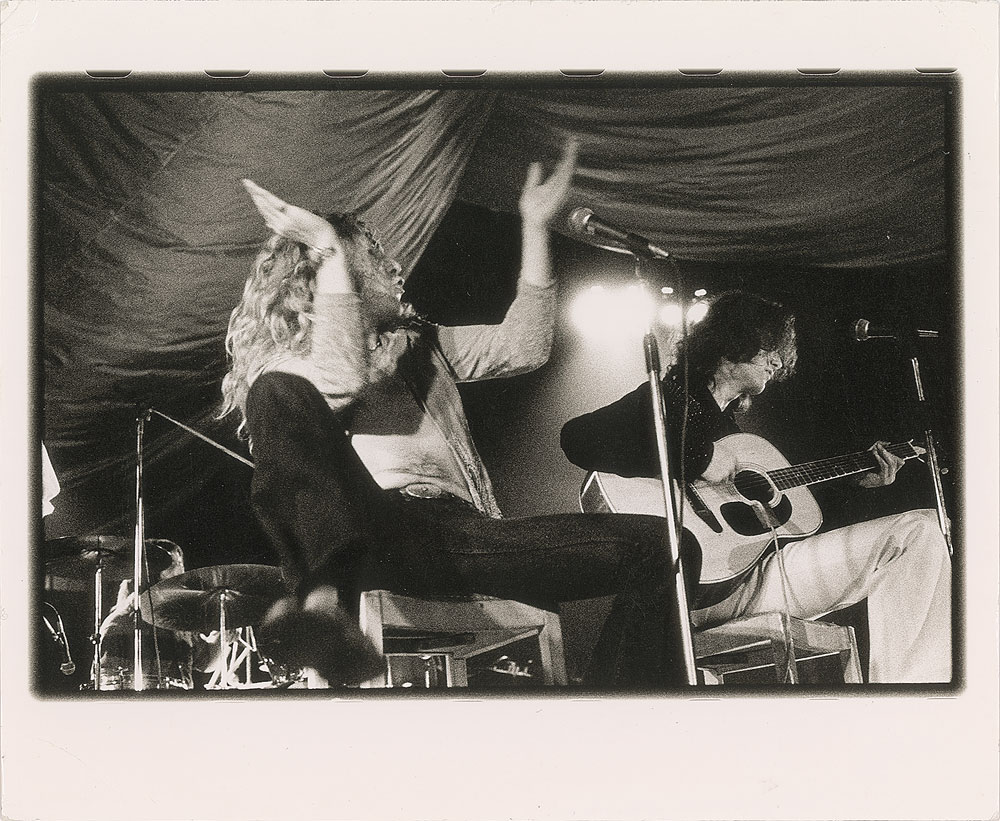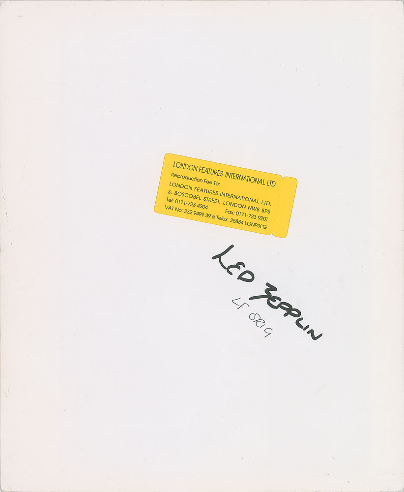Original vintage matte-finish 12 x 10 silver gelatin photo of Jimmy Page and Robert Plant performing, with John Bonham barely visible at the drum kit in the background. Reverse bears a London Features International Ltd. label. In fine condition, with scattered creasing (heaviest to corners).