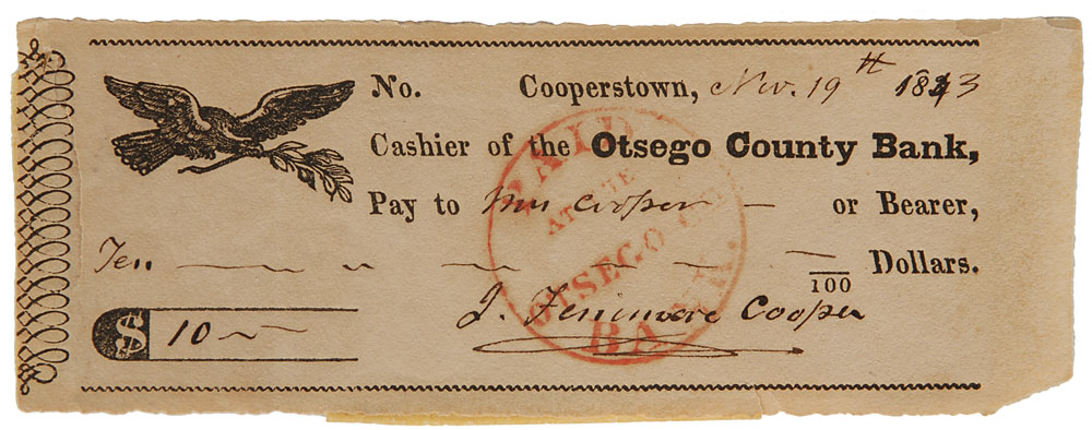Otsego County Bank check, 6 x 2.25, filled out and signed by Cooper, “J. Fenimore Cooper,” made payable to Mrs. Cooper for $10, dated November 19, 1843. In fine condition, with an unobtrusive tear to the left edge and old mounting residue on the reverse. Accompanied by an engraved portrait of Cooper bearing a preprinted signature. Pre-certified PSA/DNA.