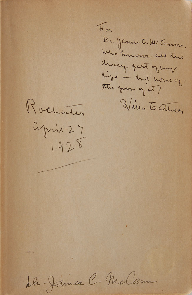Signed book: My Antonia. Boston: Houghton Mifflin Company, 1926. Hardcover, 5.25 x 7.75, 419 pages. Signed and inscribed on the first free end page in black ink, “For Dr. James E. McCann, who knows all the dreary part of my life—but none of the fun of it! Willa Cather, Rochester, April 27, 1928.” In fine condition. Pre-certified PSA/DNA.