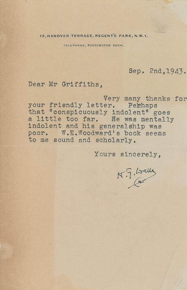 TLS, one page, 4.5 x 7, 13, Hanover Terrace, Regent’s Park letterhead, September 2, 1943. Letter to Eustace B. Griffiths, in full: “Very many thanks for your friendly letter. Perhaps that ‘conspicuously indolent’ goes a little too far. He was mentally indolent and his generalship was poor. W. E. Woodward’s book seems to me sound and scholarly.” In very good condition, with two creased corners, and light irregular toning. Accompanied by the original mailing envelope. Wells is likely referring to Meet General Grant, a 1928 biography of U. S. Grant by Woodward. Pre-certified PSA/DNA.